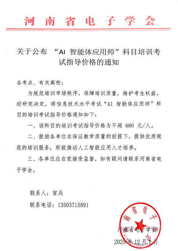 关于公布“AI智能体应用师”科目培训考试指导价格的通知